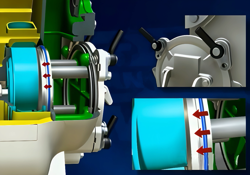 Ainsi, même avec une plaque d’usure usée, il est possible de la repositionner à la distance initiale pour garantir le rendement hydraulique optimal de la pompe.