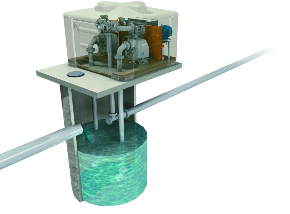 Dans le cas d’une réhabilitation d’un poste existant ou lorsque seul un regard est disponible, la station “hors sol” permettra de mettre en oeuvre la solution de pompage au débit et à la pression que requiert l’application, sans devoir changer le génie civil en place.